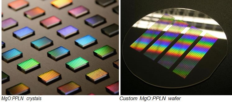 用于SHG的MgO:PPLN晶体设计得能够用于大范围的常见激光波长。每个晶体都包括多种周期,以在不同温度下实现相位匹配。用于得到可见光波段的晶体包含5种周期,在30℃~110℃温度范围下可实现泵浦波长相位匹配。调到更高温度200℃可对更长波长进行相位匹配。全部的产品都经过严格的质量检验,也可根据要求提供定制的晶体长度、厚度、增透膜和周期设计。